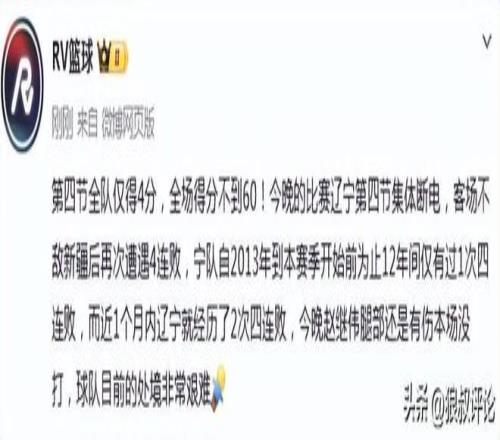 第四節(jié)全隊僅得4分,全場得分不到60!今晚的比賽遼寧第四節(jié)集體斷電,客場不敵新疆后再次遭遇4連敗,寧隊自2013年到本賽季開始前為止12年間僅有過1次四連敗,而近1個月內(nèi)遼寧就經(jīng)歷了2次四連敗,今晚趙繼偉腿部還是有傷本場沒打,球隊目前的處境非常艱難。