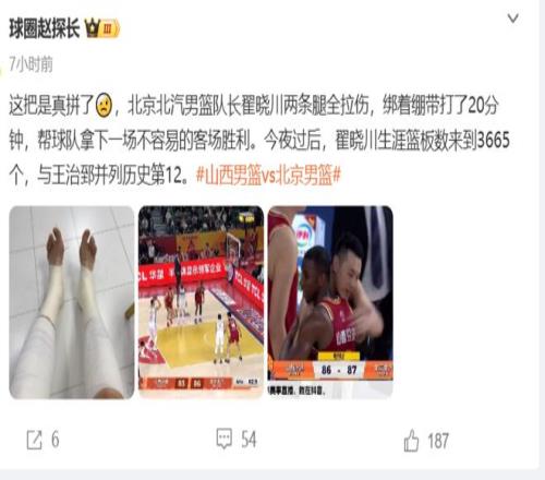 賽后媒體人“趙探長”曬出了一張翟曉川雙腿纏滿繃帶的照片,并表示:川隊這把是真拼了,北京北汽男籃隊長翟曉川兩條腿全拉傷,綁著繃帶打了20分鐘,幫球隊拿下一場不容易的客場勝利。