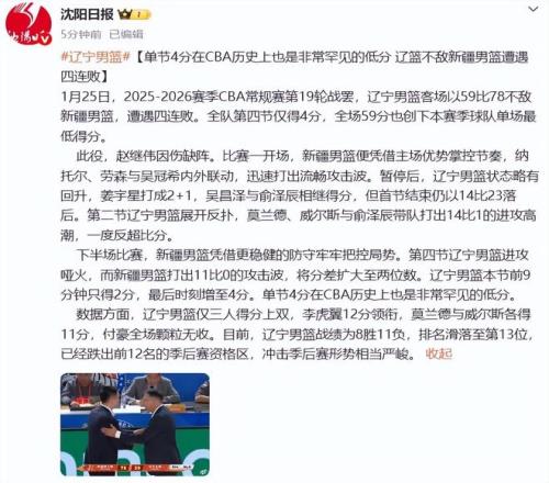 “媒體都看不下去,《沈陽日報》標題直接扎心,單節(jié)4分確實罕見。”