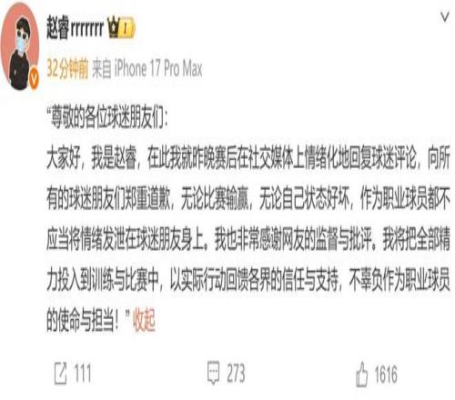 趙睿就“情緒化回復球迷評論”致歉:無論比賽輸贏都不應當將情緒發(fā)泄在球迷朋友身上