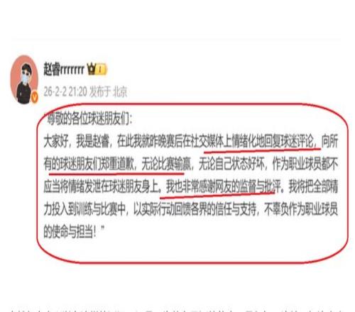 2月2日,晚上9點(diǎn)!北京隊(duì)球員趙睿,通過網(wǎng)絡(luò)平臺(tái)發(fā)文,正式向球迷進(jìn)行道歉!