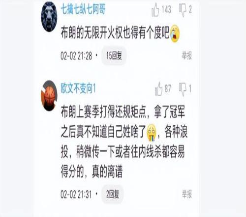 布朗是上賽季奪冠英雄,被評為總決賽MVP。但從此也飄了,飄得似乎不知自己姓什么了。球迷怒批道,“布朗上賽季打得還規(guī)矩點(diǎn),拿了冠軍之后真不知道自己姓啥了,各種浪投,稍微傳一下或者往內(nèi)線殺都容易得分的,真的離譜”、“布朗的無限開火權(quán)也得有個度吧”。廣廈再任由布朗這么打,這賽季完了,最近幾場都沒什么配合,全是掄,都想當(dāng)大哥,心態(tài)完全不對,太飄了。
