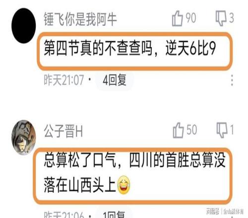 末節(jié)雙方打了個6-9比分,賽后網友們也是紛紛吐槽道“第四節(jié)真的不查查嗎,逆天6比9?!?;“總算松了口氣,四川的首勝總算沒落在山西頭上”;“好一個6-9,這不是你想的那個69式,而是中國職業(yè)籃球第一聯賽單節(jié)得分,牛的嘞!”;“我讓我村里打球賽的朋友上去打也不止這個分數”;“單節(jié)6-9,跟韓國6分鐘多鐘不得分一樣離譜”;“單節(jié)兩隊6-9,是職業(yè)球員干的事嗎?”……