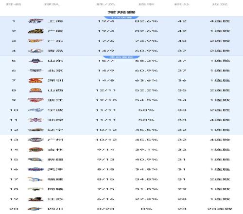 常規(guī)賽第一階段結(jié)束之后的最新積分榜排名: