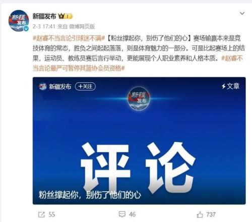 在2月3日下午新疆官方媒體“新疆發(fā)布”連續(xù)發(fā)布了兩條關(guān)于趙睿的消息,一方面是表達(dá)了自己的立場,堅決維護(hù)祖國統(tǒng)一和民族團(tuán)結(jié),另一方面也對趙睿這次不當(dāng)?shù)难孕羞M(jìn)行了抨擊?!靶陆l(fā)布”發(fā)文說“粉絲撐起了你,別傷了他們的心。賽場輸贏本來是競技體育的常態(tài),勝負(fù)之間起起落落,則是體育魅力的一部分??墒潜绕鹳悎錾系慕Y(jié)果,運動員、教練員賽后言行舉動,更能展現(xiàn)個人職業(yè)素養(yǎng)和人格本質(zhì)”。