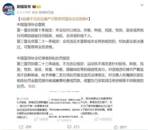 另外“新疆發(fā)布”還轉(zhuǎn)載了中國籃球協(xié)會章程,以及中國籃球協(xié)會紀(jì)律準(zhǔn)則和處罰規(guī)定。其內(nèi)容明確表示任何球員不得有以下這些行為或不當(dāng)言論,會員違反本章程或本會規(guī)定的,經(jīng)執(zhí)委會表決通過,可暫停其會員資格。對于造成不良影響的球員,可以處禁賽2-5場的處罰,情節(jié)較為嚴(yán)重的可以追究其法律責(zé)任,對于球員所在的俱樂部也會有相應(yīng)的罰款或者是核減經(jīng)費,嚴(yán)重的甚至?xí)∠渥再Y格等。