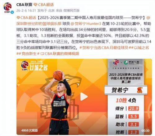 北京時間2月6日,CBA官方公布2025-26賽季第二期月度獎項,深圳男籃一戰(zhàn)封神——山東濟南小伙賀希寧當(dāng)選月度最佳國內(nèi)球員,史密斯榮膺月度最佳國際球員。這不是偶然,而是一場關(guān)于效率、統(tǒng)治力與團隊崛起的完美合奏。