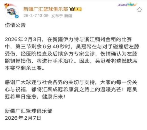 新疆男籃官方傷病公告寫(xiě)道:“2026年2月3日,在新疆男籃與浙江男籃的比賽中,第三節(jié)剩余6分49秒時(shí),吳冠希在與對(duì)手碰撞后左膝受傷。經(jīng)醫(yī)院檢查及后續(xù)多方專(zhuān)家會(huì)診,傷情確認(rèn)為左膝髕韌帶損傷,將進(jìn)行手術(shù)治療,因此吳冠希將遺憾缺席本賽季剩余比賽?!?/p>