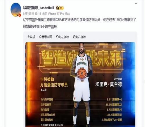 2月7日,CBA官方發(fā)布正式官宣,遼寧男籃的內(nèi)線球員莫蘭德,當(dāng)選為2025-2026賽季CBA聯(lián)賽第二期月度最佳防守球員。不得不說,我們理應(yīng)向莫蘭德表示祝賀。莫蘭德身高兩米零八,在內(nèi)線領(lǐng)域,他的防守意識和防守能力都堪稱CBA聯(lián)盟頂級水準(zhǔn),而且本賽季他始終保持穩(wěn)定高效的發(fā)揮,用實力為球隊保駕護航。