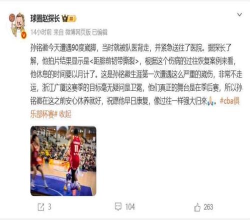 孫銘徽距腓前韌帶撕裂,預(yù)計(jì)傷停23個(gè)月,浙江廣廈衛(wèi)冕難了