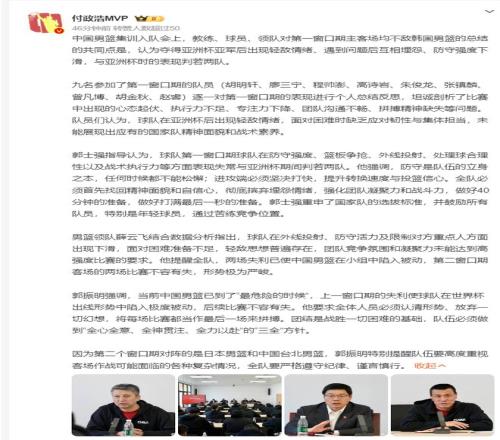中國男籃的集訓入隊會上,郭振明表示‘中男籃已經(jīng)到了最危險的時候’,上一個窗口期的二連敗讓球隊在世界杯出線形勢極度被動,后續(xù)的比賽不容有失,需要全體人員認清形勢放棄一些幻想,把每一場比賽當最后一場去拼。