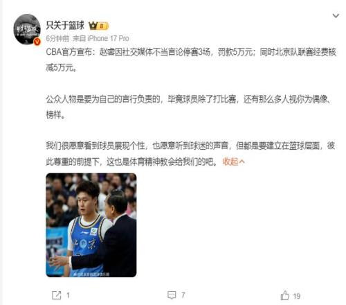北京時間2月11日晚,CBA公司官方宣布對北京男籃球員趙睿進行處罰,趙睿因為在社交媒體發(fā)布嚴重不當言論被處以停賽三場、罰款5萬元。