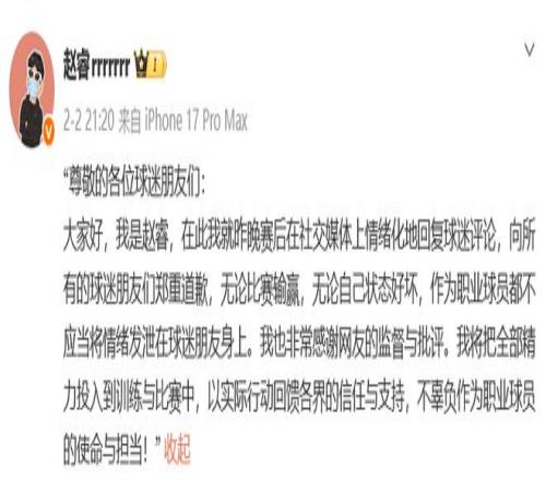 據(jù)白鹿視頻消息,近日,中國男籃隊員趙睿就賽后在社交媒體上情緒化回復(fù)球迷評論一事,向廣大球迷鄭重道歉。