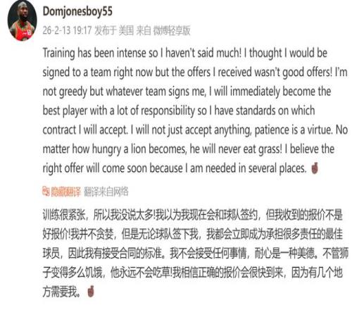 到目前為止,瓊斯都沒有獲得一份合同。其實(shí)在過(guò)去一段時(shí)間,瓊斯在NBL打球,后續(xù)回到美國(guó)養(yǎng)傷。無(wú)奈這波養(yǎng)傷之后,瓊斯并沒有回歸到CBA。根據(jù)他曝光的動(dòng)態(tài)來(lái)看:我以為我現(xiàn)在會(huì)和球隊(duì)簽約,但我收到的報(bào)價(jià)不是好報(bào)價(jià)!這樣的話語(yǔ)已經(jīng)非常明顯了,他之所以沒有回到CBA,就是因?yàn)樾劫Y沒有到位,所以他始終都沒有談妥。