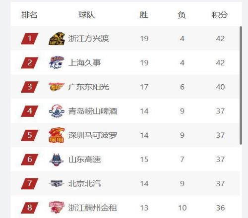 CBA常規(guī)賽第一階段的比賽結(jié)束,目前浙江廣廈隊(duì)和上海隊(duì)的戰(zhàn)績都是19勝4負(fù),位列常規(guī)賽排名榜的前2,廣東隊(duì)以17勝6負(fù)的戰(zhàn)績排名第3;青島隊(duì)的戰(zhàn)績14勝9負(fù)排名第4,深圳隊(duì)同樣14勝9負(fù)排名第5,山東高速男籃15勝7負(fù)排名第6,北京首鋼隊(duì)14勝9負(fù)排名第7,浙江稠州隊(duì)13勝10負(fù)排名第8。