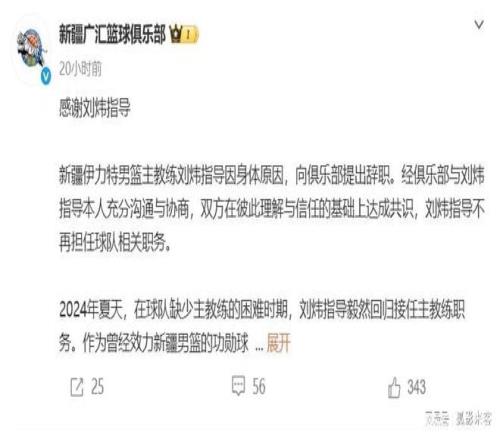 昨天新疆隊正式官宣劉煒指導(dǎo)離隊,并且感謝劉煒指導(dǎo)這兩年在新疆隊的復(fù)出,祝愿他未來的生活和工作一切順利。其實劉煒指導(dǎo)早在一個月前就已經(jīng)卸任了新疆隊主教練的職務(wù),只是他還在新疆隊擔(dān)任其他的職務(wù),并沒有離開新疆隊的教練組,這次官宣應(yīng)該是劉煒指導(dǎo)和新疆隊正式告別,春節(jié)后他可能會加入其他的球隊重新開始。