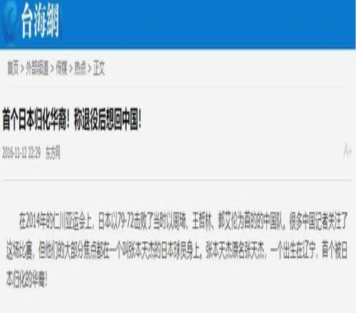 臺(tái)海網(wǎng):首個(gè)日本歸化華裔!稱退役后想回中國(guó)!