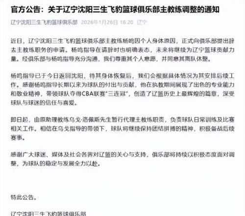回溯至1月26日,遼寧沈陽三生飛豹籃球俱樂部發(fā)布一則官方通告,令無數(shù)鐵桿擁躉心頭一沉:經(jīng)研究決定,同意主教練楊鳴因健康原因提交的離職請求;助理教練烏戈·洛佩斯即日起代理主帥職責(zé),全面接手球隊日常訓(xùn)練與臨場指揮工作。