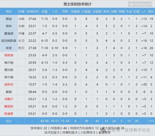 此役庫里18投7中,三分10中3,罰球9中9,砍下26分2籃板7助攻4搶斷,正負(fù)值+16。庫里生涯總得分追平皮爾斯(26397)并列歷史第19,再往前一位是鄧肯(26496分)。上半場打完,勇士領(lǐng)先1分,第三節(jié)勇士38-17單節(jié)凈勝21分。