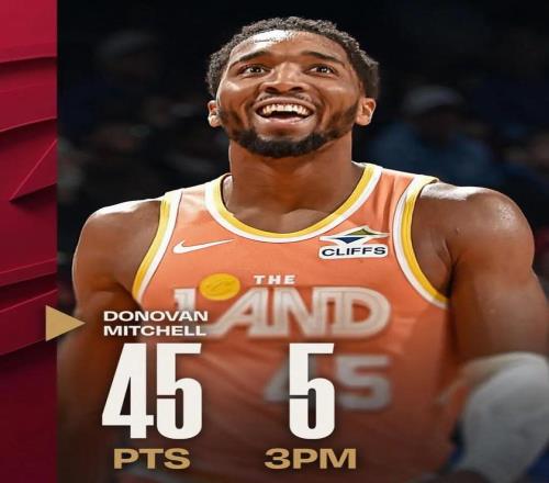 這場比賽,騎士當(dāng)家球星米切爾再度發(fā)揮出色:全場出戰(zhàn)35分鐘,投籃25中15,三分8中5,罰球12中10,拿下45分4籃板4助攻1搶斷。
