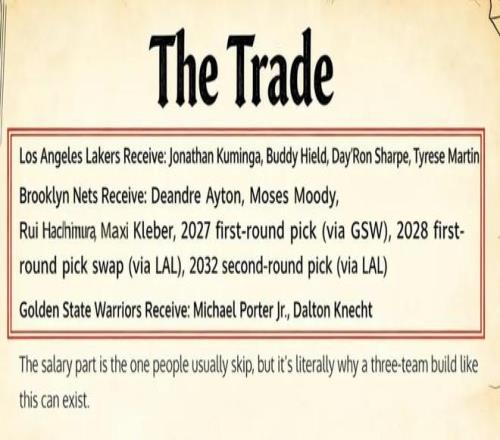 籃網(wǎng)得到:艾頓、穆迪、八村壘、克萊伯、2027年首輪簽(來自勇士)、2028年首輪簽互換權(quán)(來自湖人)、2032年次輪簽(來自湖人)