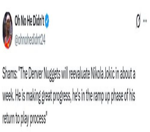 Shams在幾周前曾透露,掘金隊對約基奇能在本月底前復(fù)出持樂觀態(tài)度。盡管如今看來,這一時間節(jié)點恐難實現(xiàn),但他同時表示,這位老將中鋒的康復(fù)過程并未遭遇任何波折,目前恢復(fù)情況“進(jìn)展十分順利”,正處于復(fù)出流程的“強(qiáng)度提升階段”。