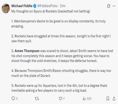 此役阿門-湯普森全場(chǎng)比賽36分鐘,23中11,罰球3中3,拿到火箭最高的25分外加7分4籃板4搶斷1蓋帽,命中率47.8%,整個(gè)第四節(jié)7中1拿2分,他出手是火箭最多。