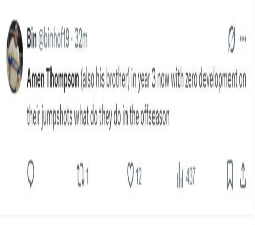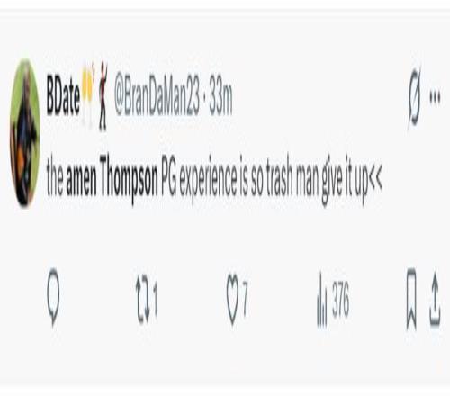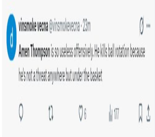 火蜜:阿門-湯普森在進(jìn)攻方面太沒用了。他完全破壞了球的運(yùn)轉(zhuǎn)節(jié)奏,因?yàn)樗谇驁?chǎng)上的任何位置都不具備威脅性,只有在籃下才有威脅。