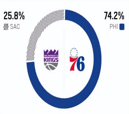 這是兩隊(duì)本賽季的第一次交鋒,在最近五次交手中,76人取得了3勝2負(fù),占據(jù)一定心理優(yōu)勢(shì)。賽前,美媒ESPN對(duì)本場(chǎng)比賽進(jìn)行了勝率預(yù)測(cè),國(guó)王勝率僅有25.8% ,劣勢(shì)明顯,76人隊(duì)勝率則高達(dá)74.2% 。