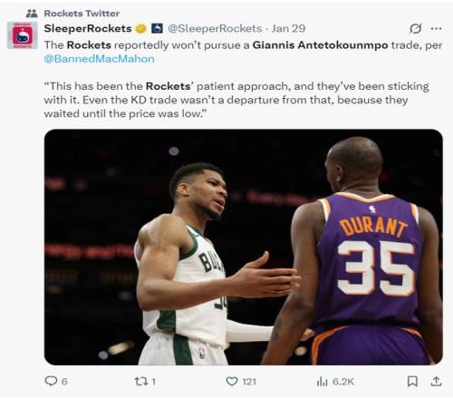 不過ESPN的記者麥克馬洪透露,火箭似乎沒有考慮交易得到揚尼斯,因為這是火箭的一貫策略,目前揚尼斯的要價太高,他們就算要出手都要等揚尼斯的要價下跌時,就跟交易杜蘭特是一樣的策略,等到價格降到最低點才出手。