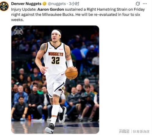 NBA今天公布了兩則傷病消息……頭一則,掘金隊(duì)的阿隆 - 戈登,右腿筋“傷上加傷”,又要開(kāi)啟4 - 6周的“養(yǎng)傷假期”!這賽季,戈登的右腿筋就像個(gè)調(diào)皮鬼老是出問(wèn)題,這已經(jīng)是他第二次“搞事情”了。上回戈登缺席,還是在11月呢,當(dāng)時(shí)他直接“躺平”了19場(chǎng)比賽。這次就算樂(lè)觀估計(jì),休養(yǎng)一個(gè)月就能“滿血復(fù)活”,可等他回來(lái),NBA常規(guī)賽都進(jìn)入最后一個(gè)月“倒計(jì)時(shí)”啦!