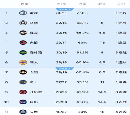 目前西部前十的排名:雷霆、馬刺、掘金、火箭、森林狼、湖人、太陽(yáng)、勇士、開(kāi)拓者、快船。