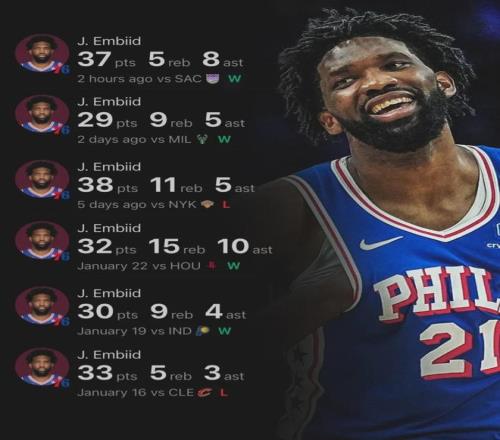 看看恩比德最近的數(shù)據(jù),你就知道帕金斯為啥要道歉了。過(guò)去6場(chǎng)比賽,恩比德有5場(chǎng)砍下30+!最近4場(chǎng)比賽,恩比德場(chǎng)均34分10籃板7助攻,投籃命中率55%,三分命中率43%。最近6場(chǎng)比賽,恩比德場(chǎng)均33.2分9籃板5.8助攻!