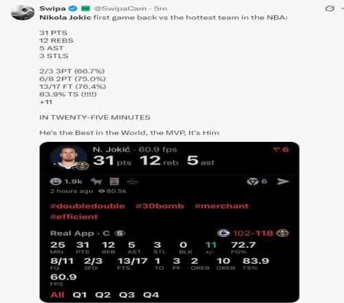 這才是MVP!傷停32天復(fù)出24分鐘31+12+5約基奇攻防無(wú)解被盛贊