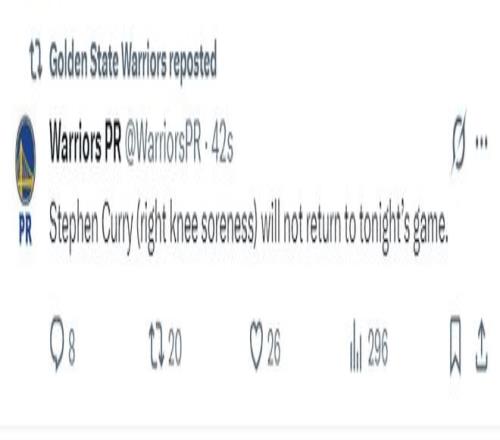 勇士官方:斯蒂芬-庫里的右膝仍有疼痛癥狀,他將缺席本場比賽的末節(jié)。