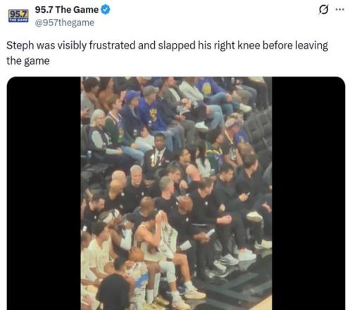 比賽第三節(jié)還剩4分多鐘時,庫里因右膝酸痛提前退出比賽,并缺席末節(jié)爭奪,賽后灣區(qū)媒體95.7 The Game曬出庫里在場邊的畫面。