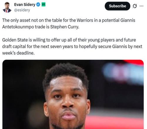 勇士隊的確正在全力追求字母哥,根據(jù)名記Evan Sidery報道,在與雄鹿隊的交易討論中,勇士隊已經(jīng)明確表態(tài),除了庫里是非賣品之外,其余球員均可以納入交易方案,包括未來七年的所有選秀權(quán)資產(chǎn)。