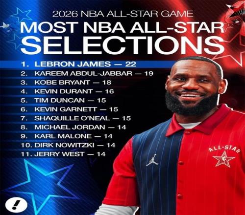 統(tǒng)計(jì)顯示,詹姆斯今年入選后,以22次入選次數(shù)再度擴(kuò)大領(lǐng)先優(yōu)勢。