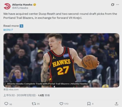 北京時(shí)間2月2日上午,亞特蘭大老鷹官方宣布:球隊(duì)將前鋒克雷伊奇送到開拓者,1換3交易得到中鋒杜普-里斯、2027年次輪簽以及2030年次輪簽。里斯接受右腳應(yīng)力性骨折手術(shù),已經(jīng)賽季報(bào)銷,老鷹相當(dāng)于用克雷伊奇換了2個(gè)次輪。