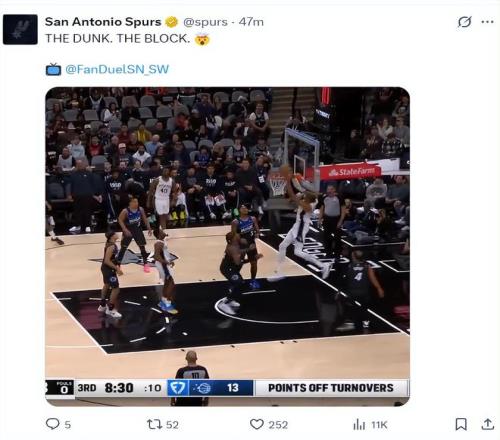 北京時(shí)間2月2日,馬刺以112-103擊敗魔術(shù)。這場(chǎng)比賽是一場(chǎng)拉鋸戰(zhàn),轉(zhuǎn)折點(diǎn)是第三節(jié)魔術(shù)單節(jié)只拿18分,末節(jié)開(kāi)場(chǎng)被馬刺一波流帶走,這場(chǎng)比賽馬刺展現(xiàn)了極強(qiáng)的攻防均衡性,文班亞馬更是攻防一體的典范,全場(chǎng)比賽25+8+4斷5帽。