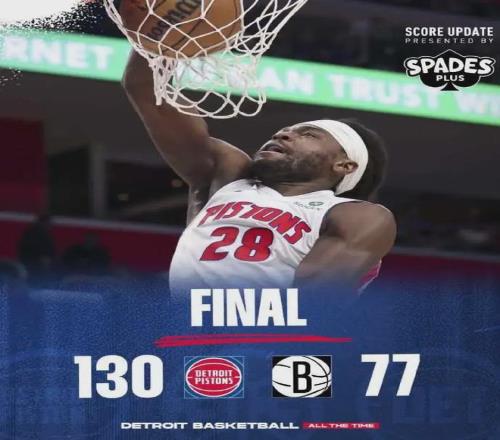 此役活塞贏了53分之多,創(chuàng)造隊史單場最大贏球分差。