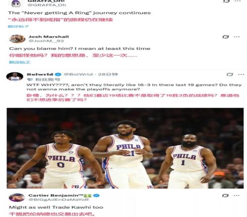 另外有網(wǎng)友說:“哈登一輩子拿不到總冠軍戒指,他的旅程還在繼續(xù)?!薄ⅰ叭绻灰姿?,那不如把萊昂納德也一起交易掉?!?、“最近19場比賽,快船的戰(zhàn)績是16勝3負,他們難道不想打季后賽了嗎?”、“快船的狀態(tài)本來已經(jīng)回來了,現(xiàn)在他們是聯(lián)盟里勢頭最火熱的球隊,哈登居然想走,背后是不是發(fā)生了什么我們不知道的內(nèi)幕?”可以看到大部分的網(wǎng)友其實還是不懂,為什么在這個時間點,哈登會和快船商量著走人。