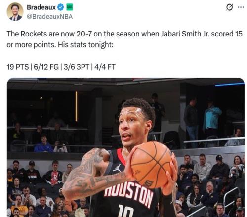 除了申京之外,小賈也是火箭隊本場杜蘭特缺席情況下拿到勝利的關(guān)鍵,他又一次成為晴雨表。