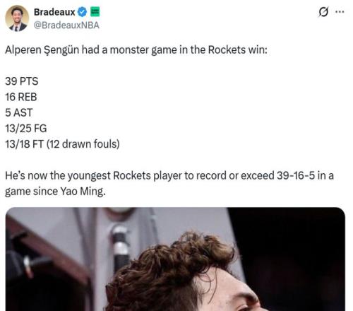 憑借這樣的表現(xiàn),23歲193天的申京成為姚明后,火箭隊史單場至少拿下39分16板5助最年輕的球員。