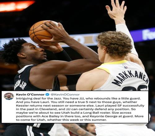 NBA記者凱文-奧康納認(rèn)為爵士隊(duì)在完成了這筆交易后前途一片光明,他表示:對(duì)于爵士來(lái)說(shuō)這絕對(duì)是一筆極具吸引力的交易,現(xiàn)在他們擁有小賈倫,三J可以像后衛(wèi)一樣沖擊也可以完成籃板任務(wù),他還是一個(gè)可以從1防到5的最佳防守球員。此外爵士還有馬爾卡寧,他曾經(jīng)在騎士隊(duì)甚至擔(dān)任過(guò)得分后衛(wèi)的角色;
