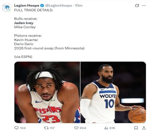 北京時(shí)間2月4日凌晨,ESPN名記Shams透露,芝加哥公牛、底特律活塞、明尼蘇達(dá)森林狼三隊(duì)達(dá)成一筆交易,邁克-康利這名老將會(huì)加盟公牛,赫爾特這位射手會(huì)加盟活塞馳援坎寧安。