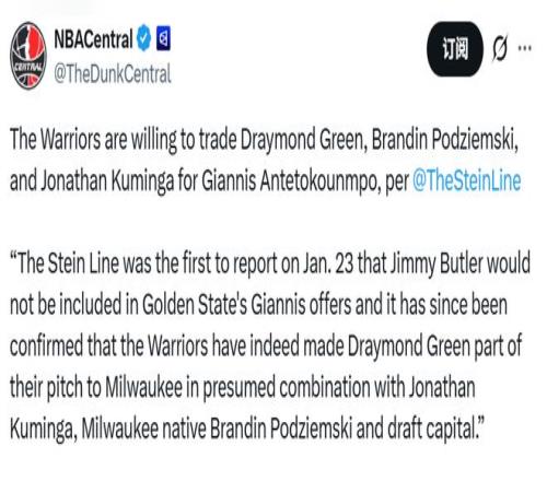 Stein表示:“1月23日我們已率先報(bào)道,吉米-巴特勒不會被納入勇士隊(duì)追逐字母哥的交易報(bào)價(jià)中。此后消息得到證實(shí),勇士隊(duì)為說服雄鹿交易,已明確將德雷蒙德-格林納入交易方案,這份報(bào)價(jià)大概率還包含喬納森-庫明加、土生土長的威斯康星州密爾沃基人波杰姆斯基,以及若干選秀資產(chǎn)?!?/p>