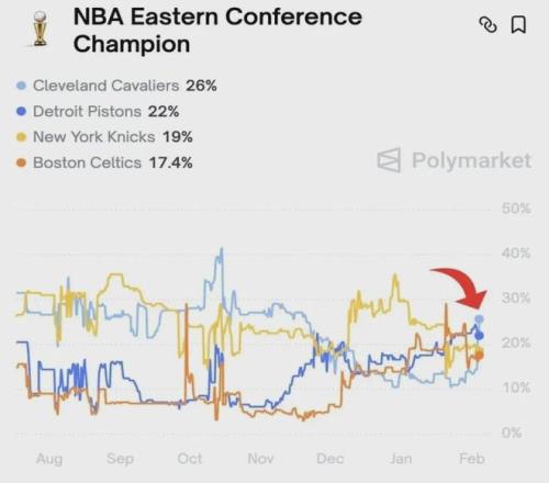 數(shù)據(jù)網(wǎng)站PolyMarket顯示,隨著哈登加盟,騎士在東部奪冠的概率從之前的11%飆升至26%,力壓目前東部戰(zhàn)績前二的活塞和尼克斯,足見前者的影響力。