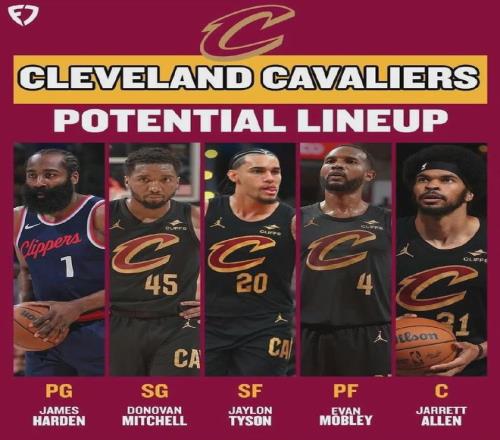 美媒預(yù)測騎士接下來的首發(fā)陣容,乃哈登+米切爾+杰倫-泰森+莫布里+阿倫。