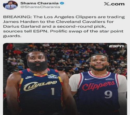 爆料王Shams:快船將36歲的哈登送至騎士,換回26歲的加蘭+2026年次輪簽。